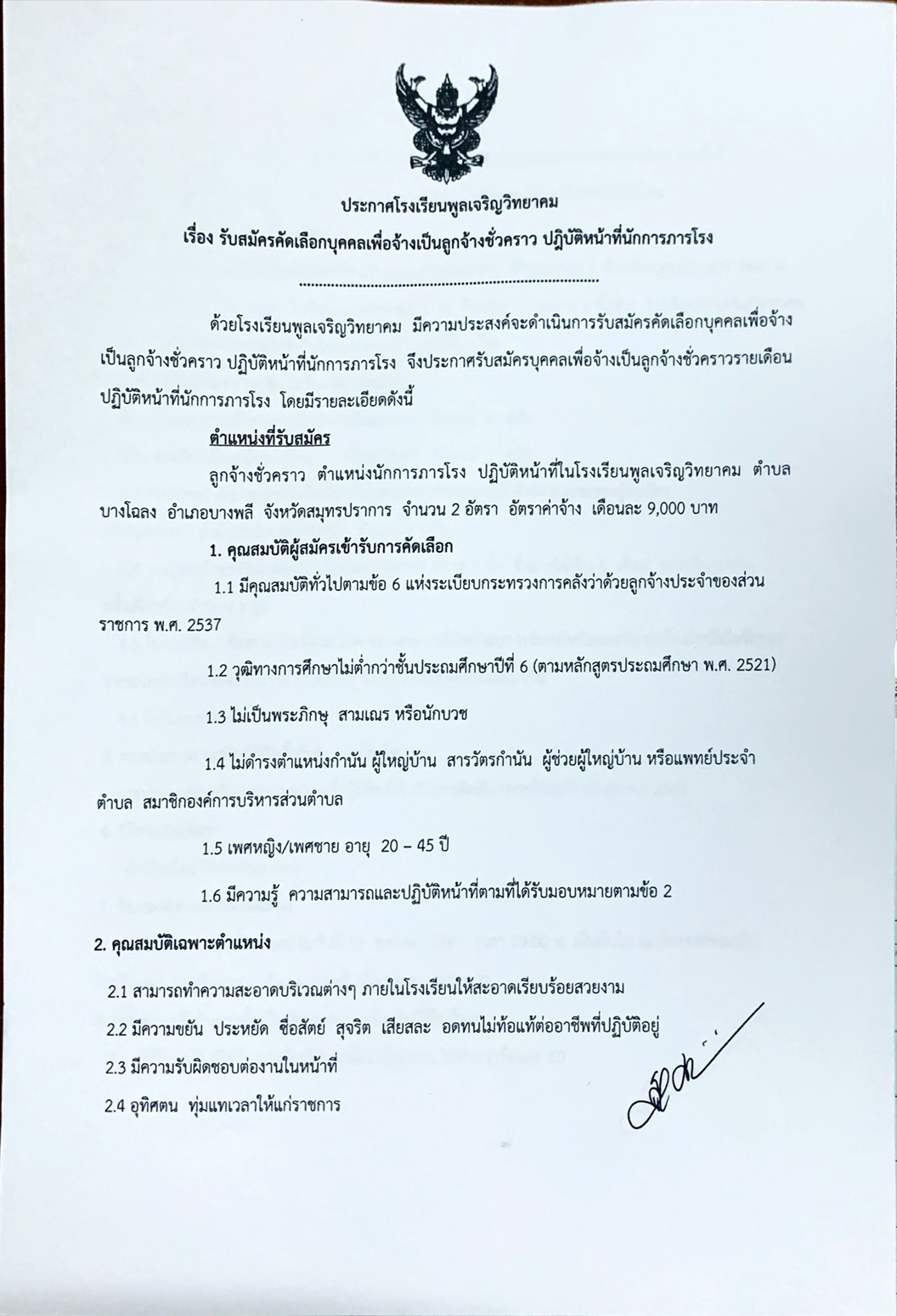 ประกาศโรงเรียนพูลเจริญวิทยาคม เรื่อง รับสมัครคัดเลือกบุคคลเพื่อจ้างเป็นลูกจ้างชั่วคราว ปฏิบัติหน้าที่นักการภารโรง แนะแนวเรื่อง พิธีประดับเข็มตราสัญลักษณ์โรงเรียน นักเรียนชั้นมัธยมศึกษาปีที่ 4 และคณะกรรมการนักเรียน โรงเรียนพูลเจริญวิทยาคม ประจำปีการศึกษา 2563 พิธีทำบุญตักบาตร เนื่องในวันคล้ายวันสวรรคต พระบาทสมเด็จพระบรมชนกาธิเบศร มหาภูมิพลอดุลยเดชมหาราช บรมนาถบพิตร 13 ตุลาคม 2563 และพระบาทสมเด็จพระจุลจอมเกล้าเจ้าอยู่หัว 23 ตุลาคม 2563