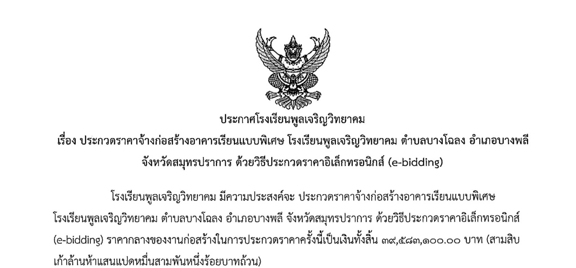 เรื่อง ประกวดราคาจ้างก่อสร้างอาคารแบบเรียนพิเศษ โรงเรียนพูลเจริญวิทยาคม ตำบลบางโฉลง อำเภอบางพลี จังหวัดสมุทรปราการ ด้วยวิธีประกวดราคาอิเล็กทรอนิกส์ (e-bidding)