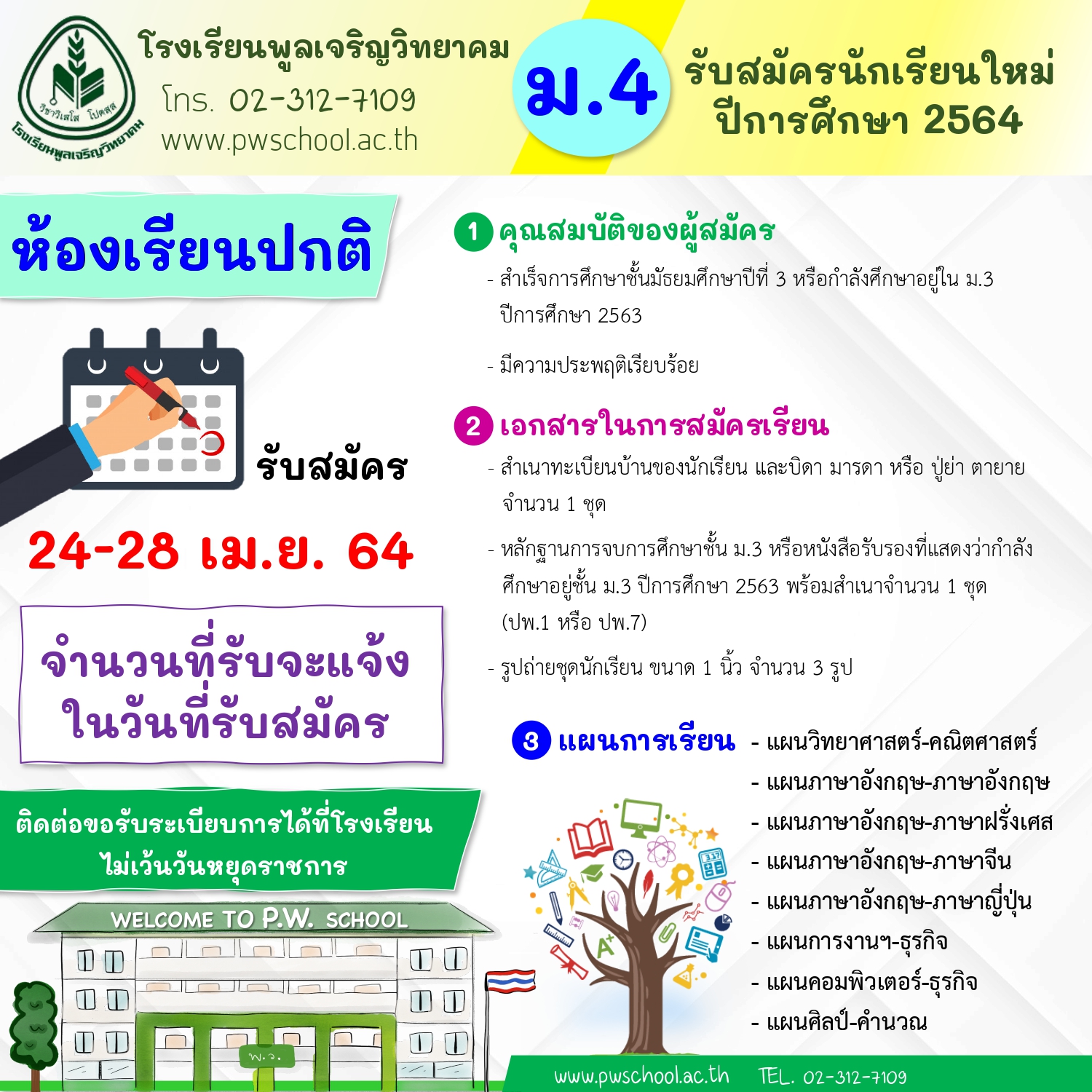 การรับสมัครนักเรียนใหม่ ห้องปกติ ม.4 ปีการศึกษา 2564 โรงเรียนพูลเจริญวิทยาคม