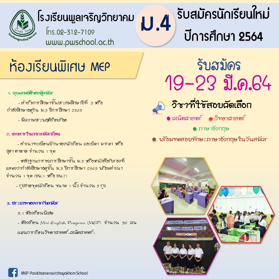 การรับสมัครนักเรียนใหม่ ห้องเรียนพิเศษ ม.4 ปีการศึกษา 2564 โรงเรียนพูลเจริญวิทยาคม แนะแนวเรื่อง การรับสมัครนักเรียนใหม่ ห้องปกติ ม.1 ปีการศึกษา 2564 โรงเรียนพูลเจริญวิทยาคม การรับสมัครนักเรียนใหม่ ห้องเรียนพิเศษ ม.1 ปีการศึกษา 2564 โรงเรียนพูลเจริญวิทยาคม