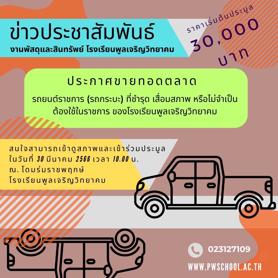 ประกาศโรงเรียนพูลเจริญวิทยาคม เรื่อง ขายทอดตลาดรถยนต์ (รถกระบะ) ที่ชำรุด เสื่อมสภาพ หรือไม่จำเป็นต้องใช้ในราชการของโรงเรียนพูลเจริญวิทยาคม