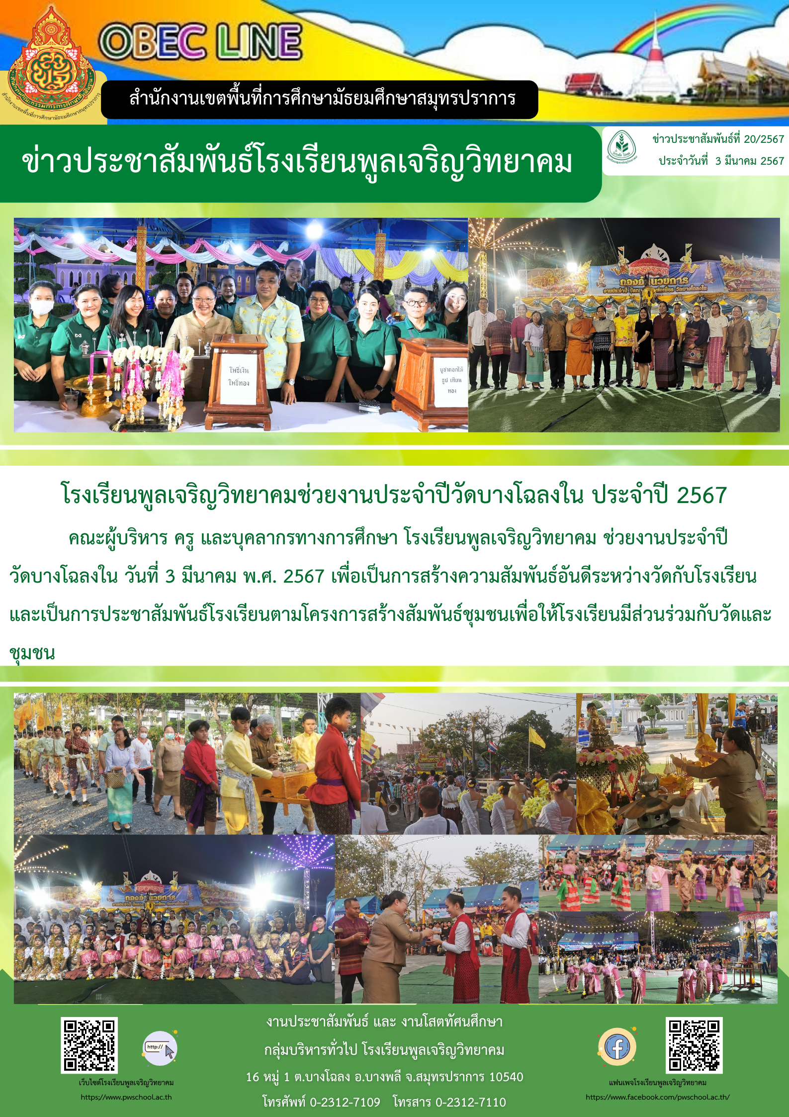 คณะผู้บริหาร ครู และบุคลากรทางการศึกษา โรงเรียนพูลเจริญวิทยาคม ช่วยงานประจำปีวัดบางโฉลงใน วันที่ 3 มีนาคม พ.ศ. 2567 เพื่อเป็นการสร้างความสัมพันธ์อันดีระหว่างวัดกับโรงเรียน และเป็นการประชาสัมพันธ์โรงเรียนตามโครงการสร้างสัมพันธ์ชุมชนเพื่อให้โรงเรียนมีส่วนร่วมกับวัดและชุมชน