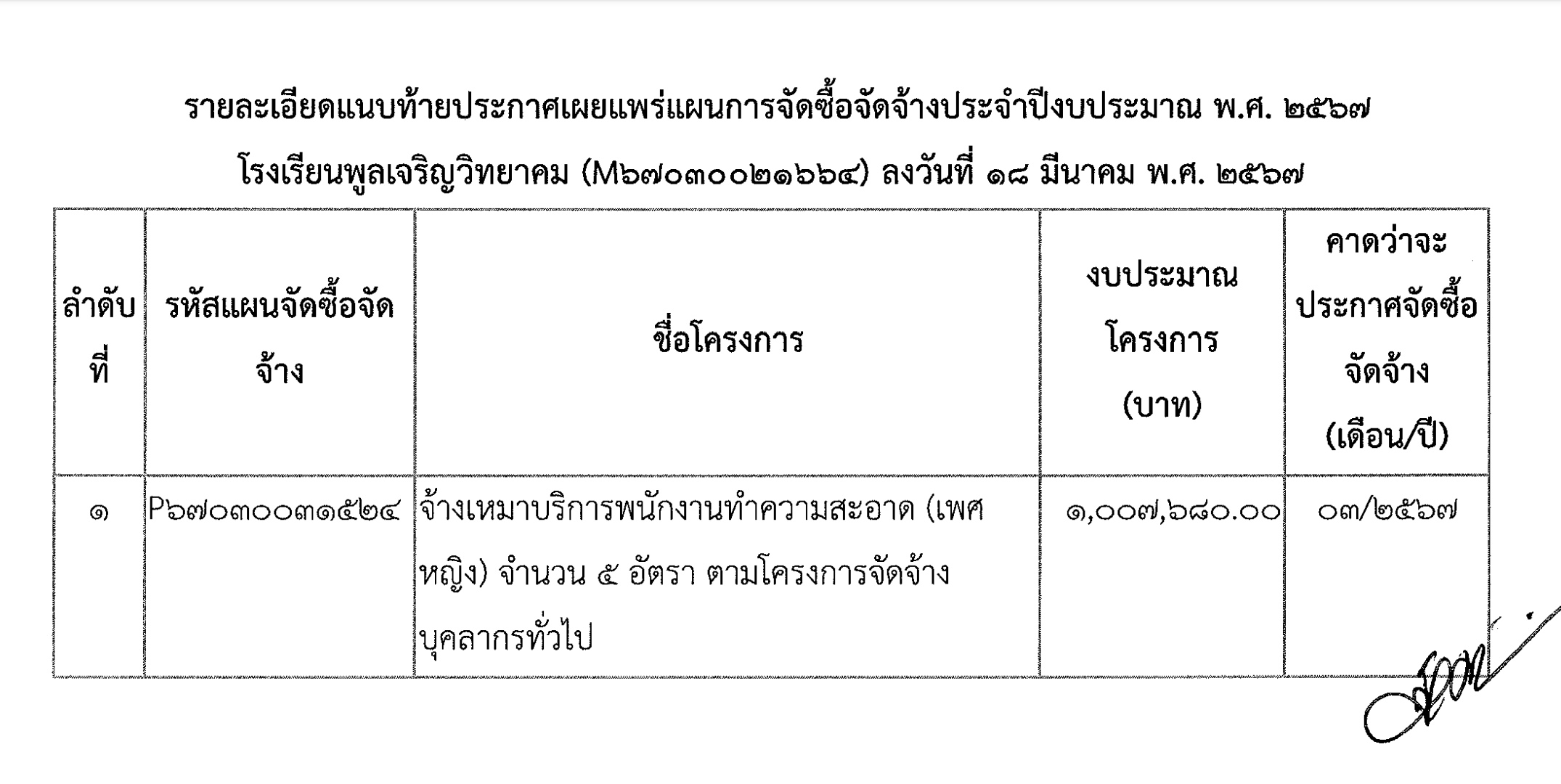 เรื่อง เผยแพร่แผนการจัดซื้อจัดจ้าง ประจำปีงบประมาณ พ.ศ. ๒๕๖๗