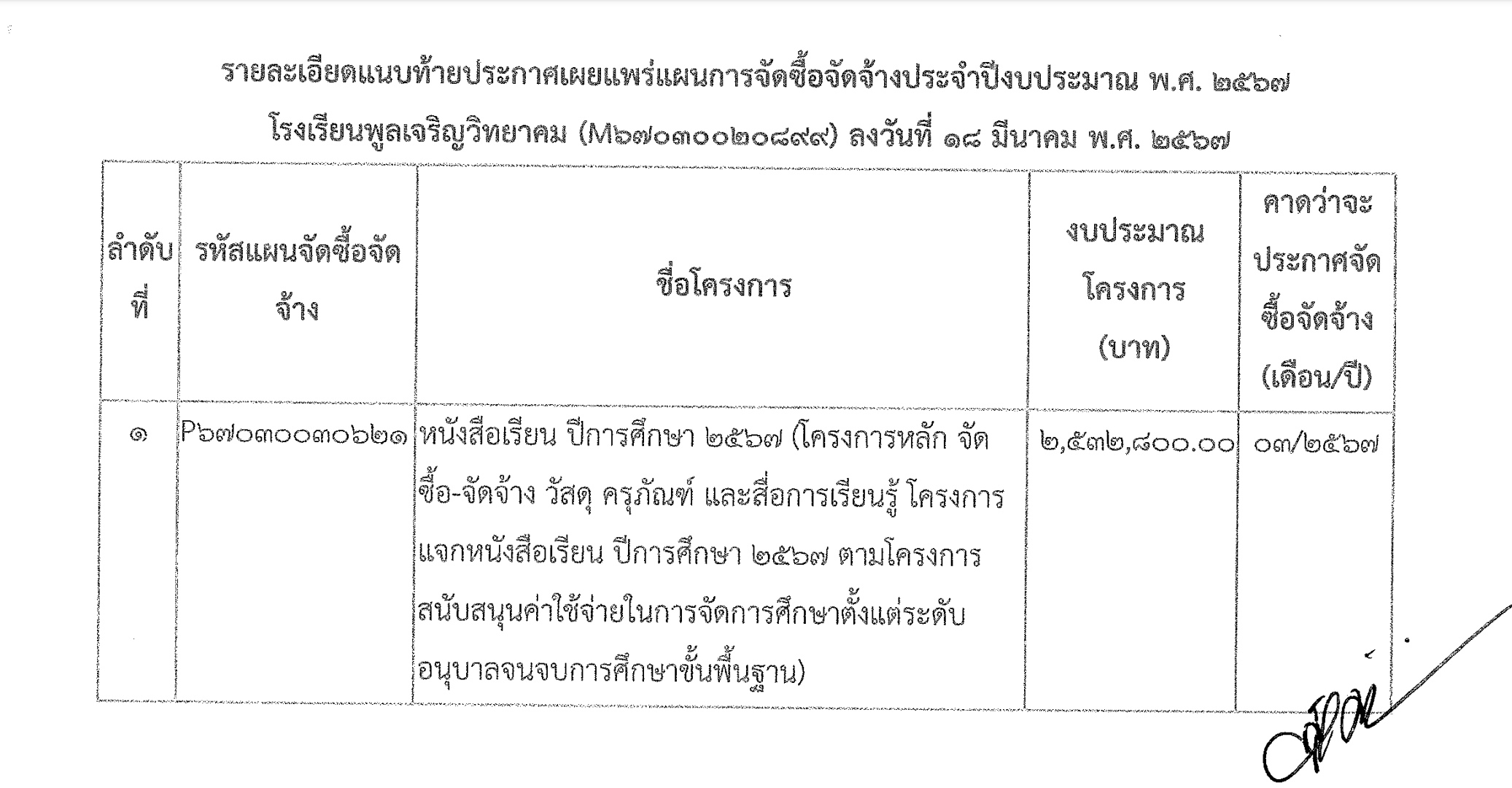 เรื่อง เผยแพร่แผนการจัดซื้อจัดจ้าง ประจำปีงบประมาณ พ.ศ. ๒๕๖๗