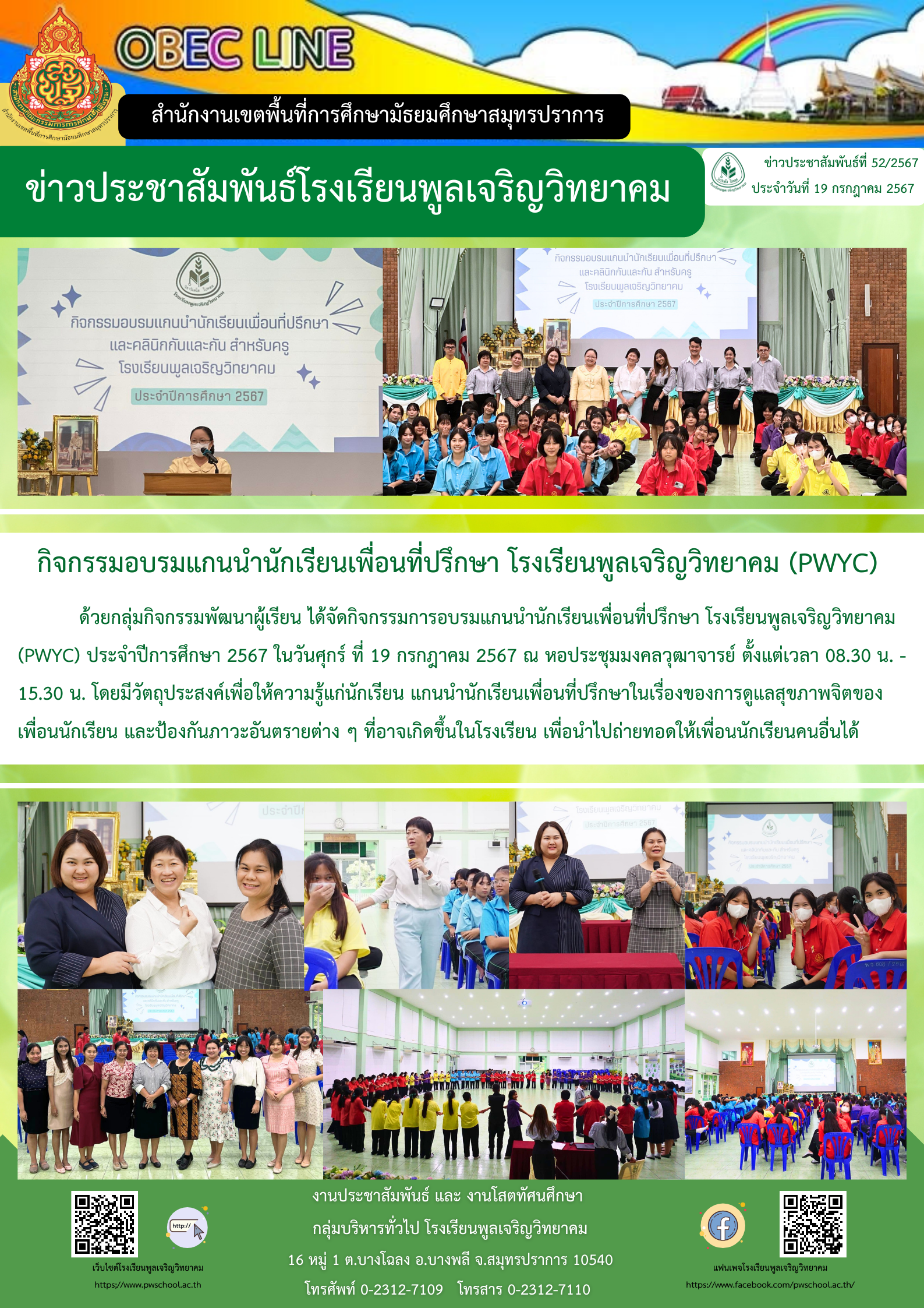 กิจกรรมอบรมแกนนำนักเรียนเพื่อนที่ปรึกษา โรงเรียนพูลเจริญวิทยาคม (PWYC)
