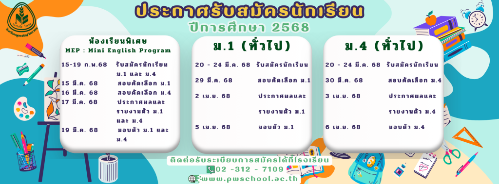 ติดตามรายละเอียดได้ทางหน้าเว็บไซต์ https://sites.google.com/pwschool.ac.th/pwadmission68/%E0%B8%AB%E0%B8%99%E0%B8%B2%E0%B9%81%E0%B8%A3%E0%B8%81