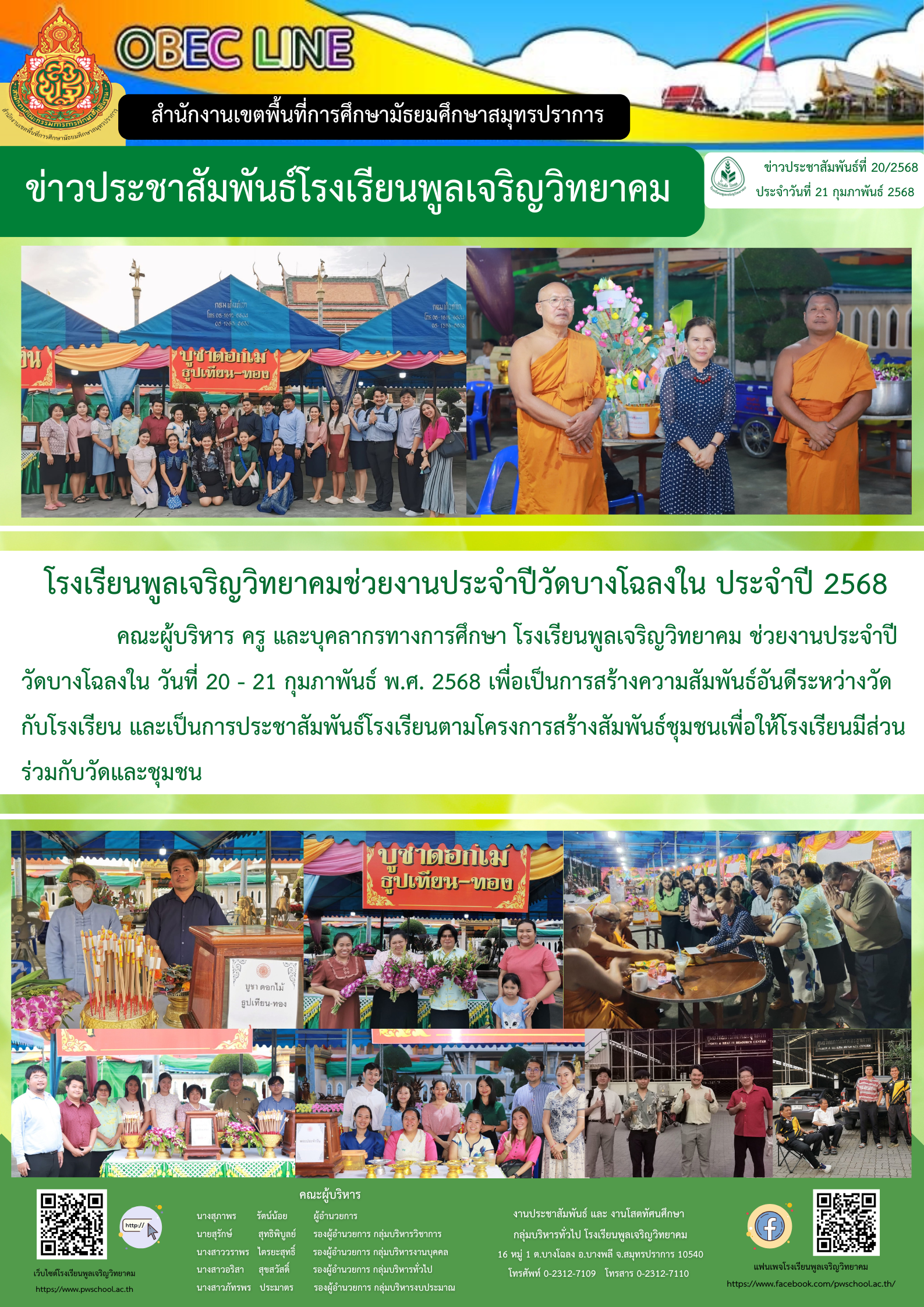 คณะผู้บริหาร ครู และบุคลากรทางการศึกษา โรงเรียนพูลเจริญวิทยาคม ช่วยงานประจำปี วัดบางโฉลงใน วันที่ 20 - 21 กุมภาพันธ์ พ.ศ. 2568 เพื่อเป็นการสร้างความสัมพันธ์อันดีระหว่างวัดกับโรงเรียน และเป็นการประชาสัมพันธ์โรงเรียนตามโครงการสร้างสัมพันธ์ชุมชนเพื่อให้โรงเรียนมีส่วนร่วมกับวัดและชุมชน