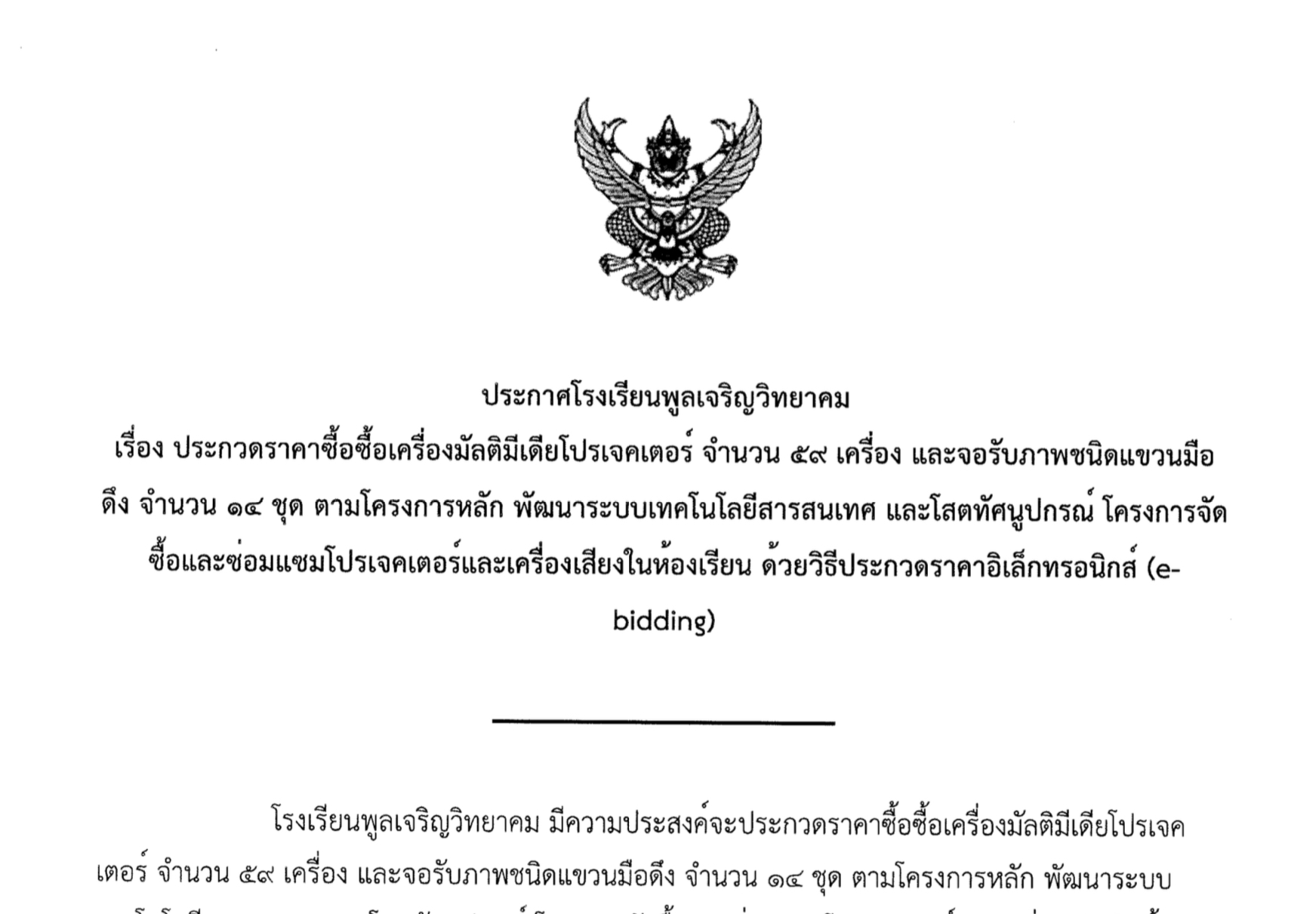 เรื่อง ประกวดราคาซื้อซื้อเครื่องมัลติมีเดียโปรเจคเตอร์ จำนวน ๕๙ เครื่อง และจอรับภาพชนิดแขวนมือดึง จำนวน ๑๔ ชุด ตามโครงการหลัก พัฒนาระบบเทคโนโลยีสารสนเทศ และโสตทัศนูปกรณ์ โครงการจัดซื้อและซ่อมแซมโปรเจคเตอร์และเครื่องเสียงในห้องเรียน ด้วยวิธีประกวดราคาอิเล็กทรอนิกส์ (e-bidding)