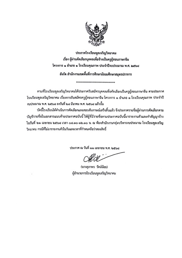 เรื่อง ผู้ผ่านคัดเลือกบุคคลเพื่อจ้างเป็นครูผู้สอนภาษาจีน