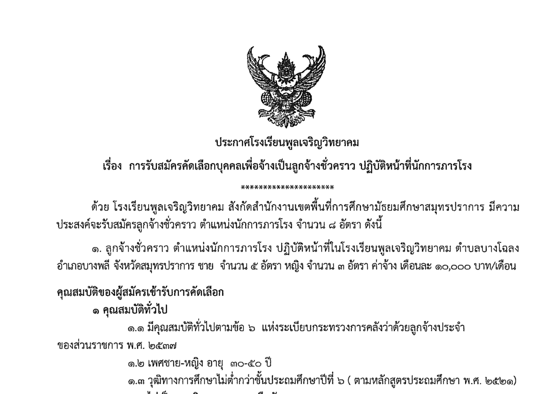 เรื่อง การรับสมัครคัดเลือกบุคคลเพื่อจ้างเป็นลูกจ้างชั่วคราว ปฏิบัติหน้าที่นักการภารโรง