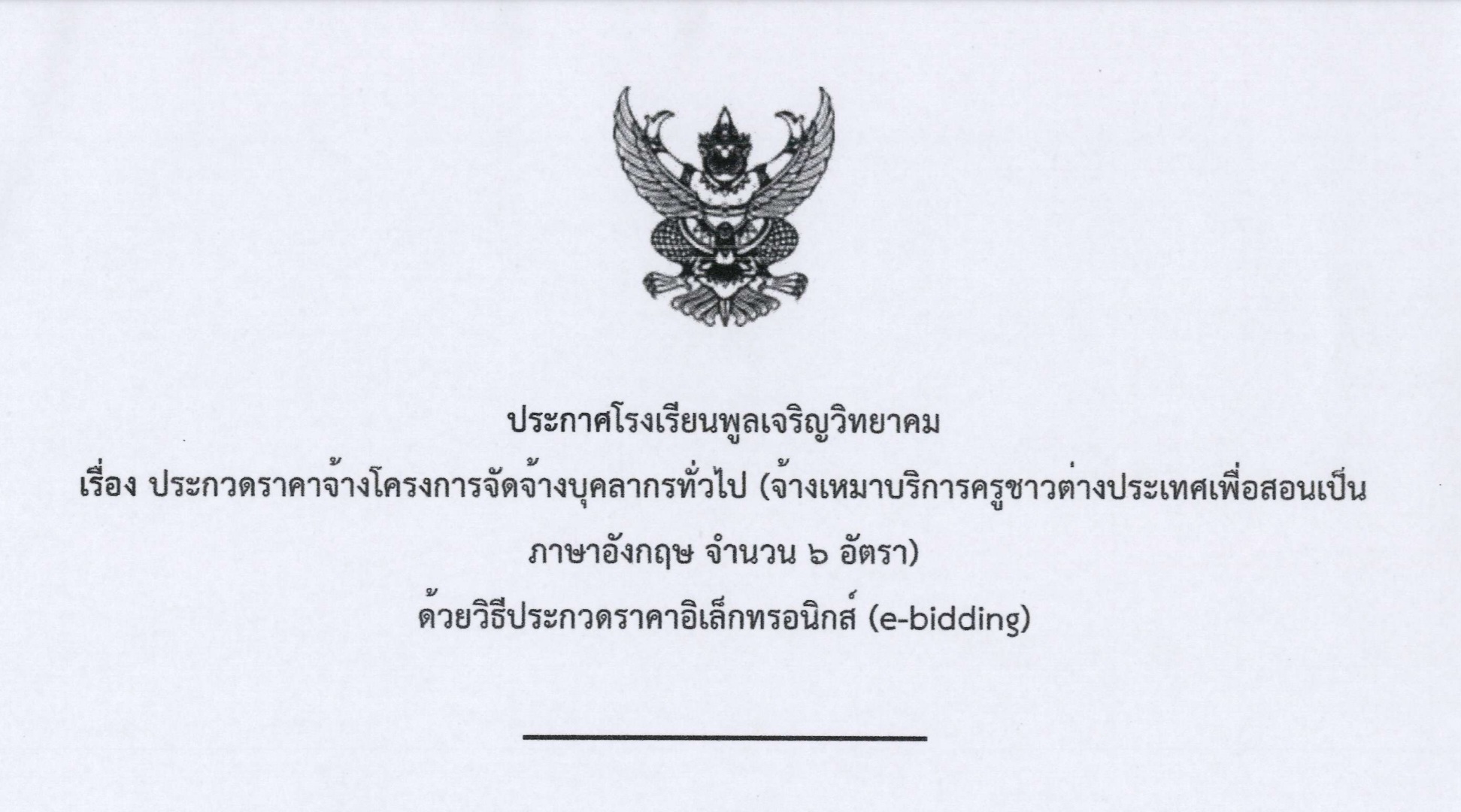 ประกาศโรงเรียนพูลเจริญวิทยาคม เรื่อง ประกวดราคาจ้างโครงการจัดจ้างบุคลากรทั่วไป (จ้างเหมาบริการครูชาวต่างประเทศเพื่อสอนเป็นภาษาอังกฤษ จำนวน 5 อัตรา) ด้วยวิธีประกวดราคาอิเล็กทรอนิกส์ (e-bidding)