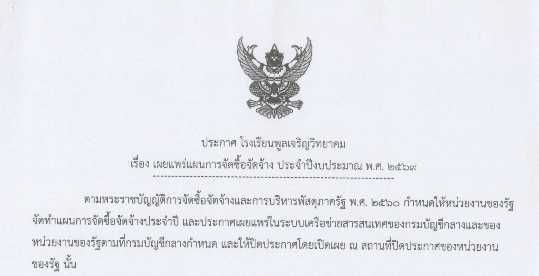 ประกาศ โรงเรียนพูลเจริญวิทยาคม เรื่อง เผยแพร่แผนการจัดซื้อจัดจ้าง ประจำปีงบประมาณ พ.ศ. ๒๕๖๙