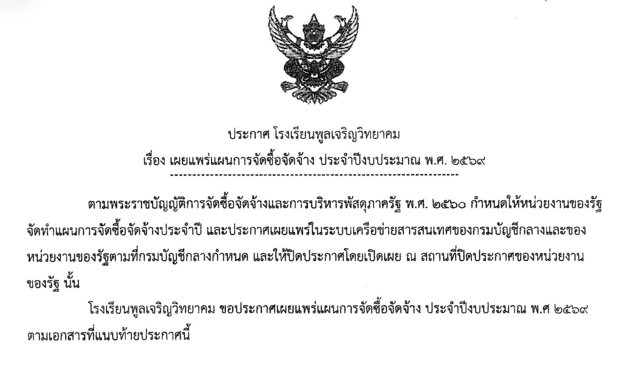 ประกาศ โรงเรียนพูลเจริญวิทยาคม เรื่อง เผยแพร่แผนการจัดซื้อจัดจ้าง ประจำปีงบประมาณ พ.ศ. ๒๕๖๙