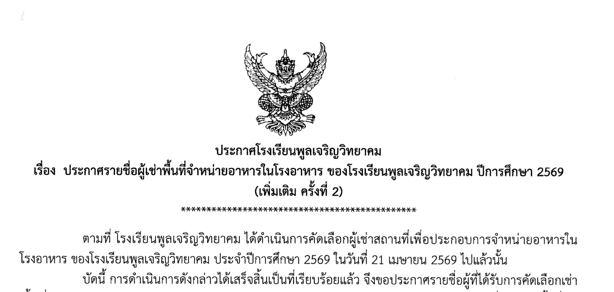 เรื่อง ประกาศรายชื่อผู้เช่าพื้นที่จำหน่ายอาหารในโรงอาหาร ของโรงเรียนพูลเจริญวิทยาคม ปีการศึกษา 2569 (เพิ่มเติม ครั้งที่ 2)